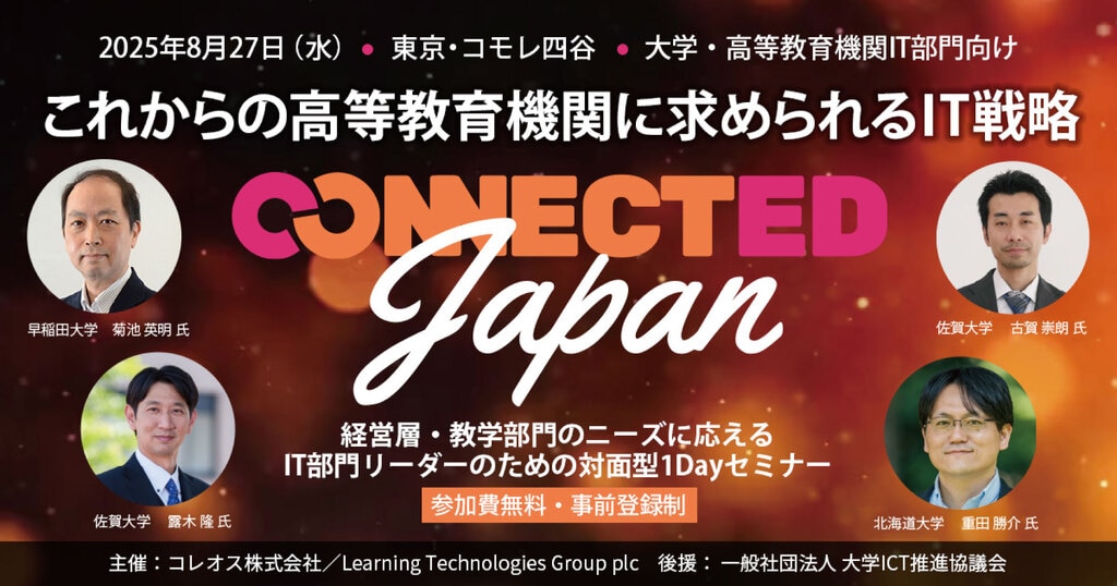 コレオス株式会社は、2025年8月27日に高等教育機関のCIO、IT部門長とその教職員の方を対象にセミナーイベント「Connected Japan -これからの高等教育機関に求められるIT戦略-」を開催いたしました。本記事は、各講演のまとめをご紹介する、開催報告となります。