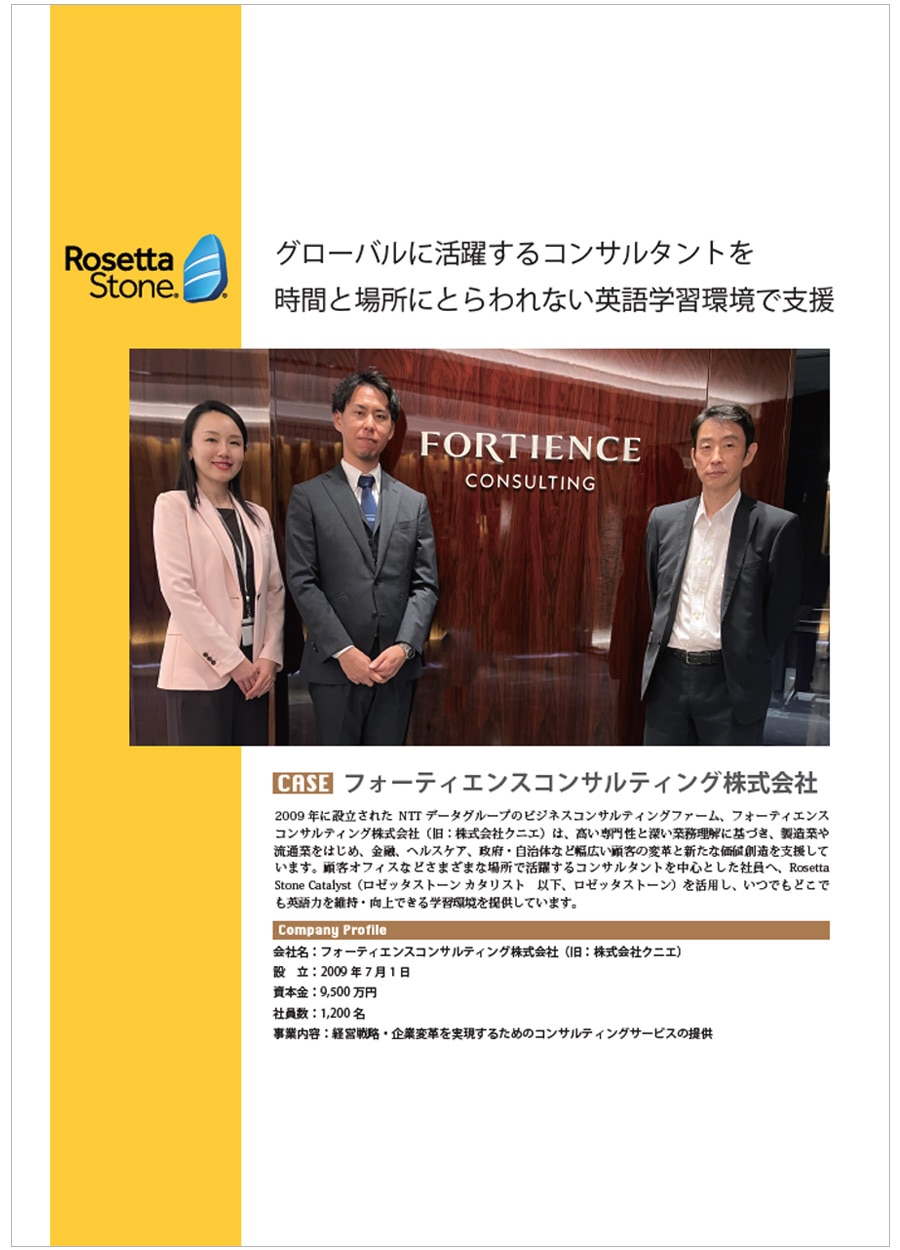 顧客オフィスなどさまざまな場所で活躍するコンサルタントを中心とした社員へ、Rosetta Stone Catalyst(ロゼッタストーン カタリスト)を活用し、いつでもどこでも英語力を維持・向上できる学習環境を提供しています。