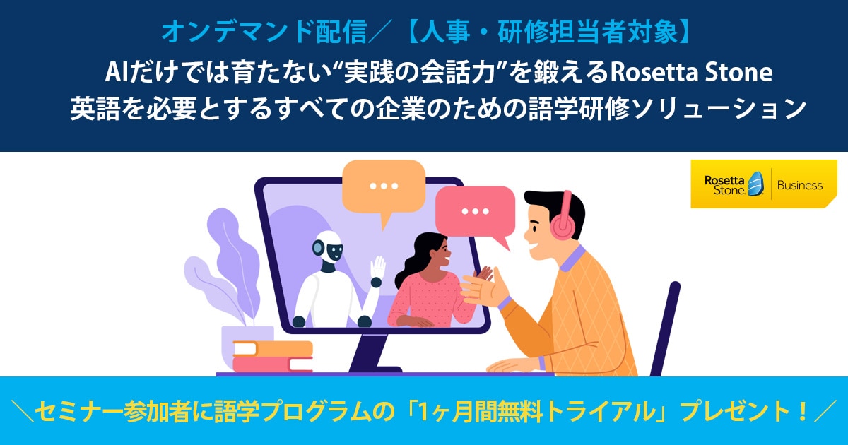 グローバル化が進む現在、そのなかで活躍するためにはコミュニケーションの土台となる“通じる外国語スキル”が必要不可欠であり、企業においても教育機関においても、その育成は急務です。 従業員の語学力強化に課題を感じられている企業の皆様、学生の外国語教育を拡充されたい教育機関の皆様、ロゼッタストーンで通じる外国語スキルを育成しませんか。